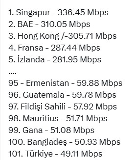 Türkiye 49,11 Mbps ile 101. sırada yer alırken, Ermenistan, Guatemala, Fildişi Sahilleri ve Bangladeş gibi ülkelerin gerisinde kaldı.