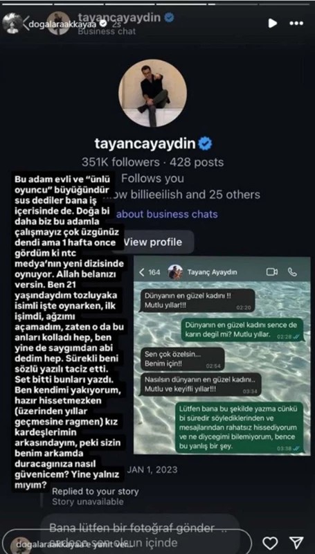 Doğa Lara Akkaya, Ayaydın'ın kendisine attığı, "Dünyanın en güzel kadını! Mutlu yıllar" mesajını sosyal medya hesabından ifşa ederek, oyuncuya, "Dünyanın en güzel kadını sence de karın değil mi?" cevabını verdiği görüldü. Ardından Ayaydın'ın, "Sen çok özelsin benim için" karşılığını verdi.