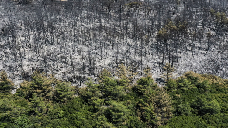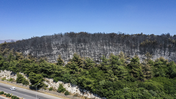 İzmir'in Buca ilçesinde havadan ve karadan müdahaleyle kontrol altına alınan yangında zarar gören ormanlık alan dronla görüntülendi.