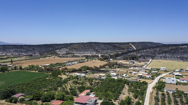 Türkiye'nin çeşitli illerinden gelen ekiplerin bölgedeki soğutma çalışmaları sürüyor. Büyük bölümü kızılçam ormanı olan yanan alanlar, dronla görüntülendi.