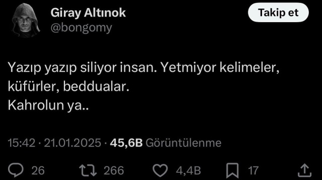 Bolu Kartalkaya'da 79 kişinin hayatını kaybettiği yangın felaketinin ardından tepkisini, "Yazıp yazıp siliyor insan. Yetmiyor kelimeler, küfürler, beddualar. Kahrolun ya..." ifadeleriyle dile getiren ünlü oyuncu Giray Altınok, daha sonra bu paylaşımını silince kısa sürede eleştirilerin odağına oturdu. Altınok, çözümü sosyal medya hesabını kapatmakta buldu.