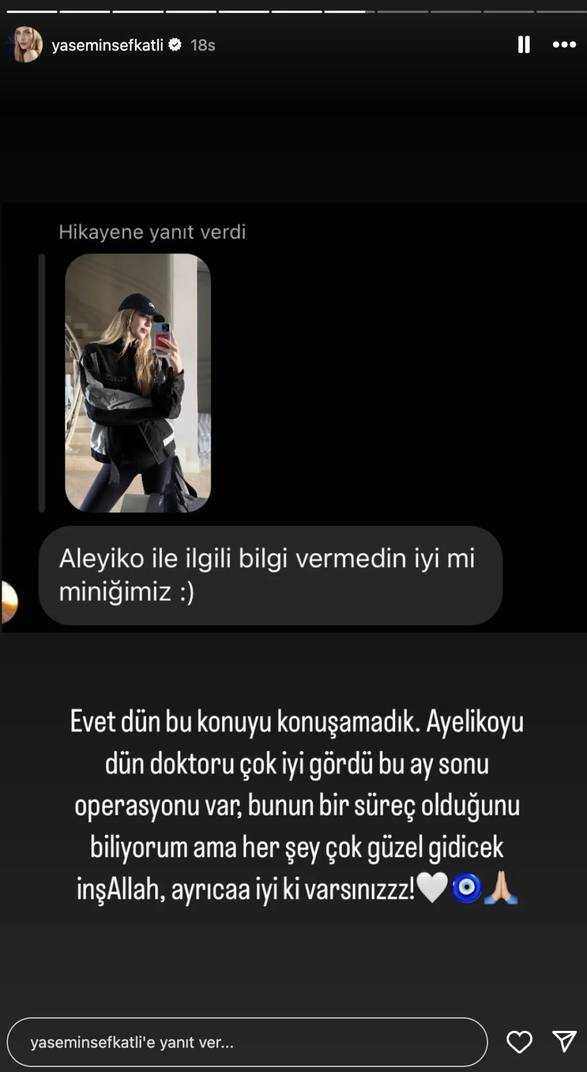 Şefkatli sözlerinde, "Evet dün bu konuyu konuşamadık. Ayel'i dün doktoru çok iyi gördü. Bu ay sonu operasyonu var. Bunun bir süreç olduğunu ama her şe güzel gidecek inşallah ayrıca iyi ki varsınız" dedi.