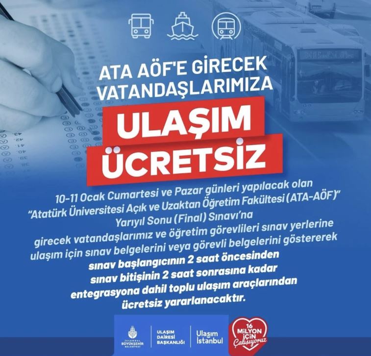 Atatürk Üniversitesi Açık ve Uzaktan Öğretim Fakültesi yarıyıl sonu sınavları nedeniyle, 10-11 Ocak Cumartesi ve Pazar günleri belirli saatler arasında toplu ulaşım ücretsiz olacak.
