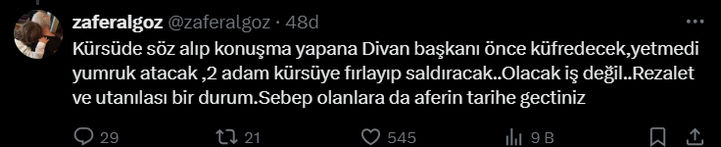 Zafer Algöz, paylaşımında; "Kürsüde söz alıp konuşma yapana divan başkanı önce küfredecek, yetmedi yumruk atacak, 2 adam kürsüye fırlayıp saldıracak... Olacak iş değil... Rezalet ve utanılası bir durum. Sebep olanlara da aferin tarihe geçtiniz" dedi.