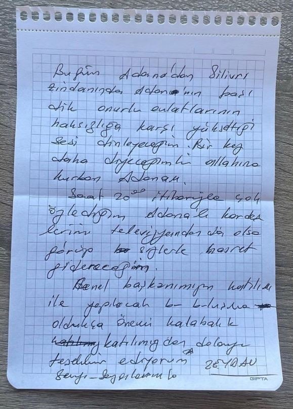 "Bugün Silivri zindanında Adana'nın başı dik, onurlu evlatlarının haksızlığa karşı yükselttiği sesi dinleyeceğim. Bir kez daha diyeceğim ki; Allah'ına kurban Adanam! Saat 20.00 itibarıyla, çok özlediğim Adanalı kardeşlerimi televizyondan da olsa görüp sizlerle hasret gidereceğim. Genel Başkanımızın katılımıyla yapılacak bu buluşma oldukça önemli. Kalabalık katılımınızdan dolayı teşekkür ediyorum. Sevgi ve saygılarımla..."